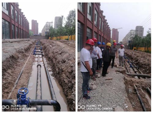 “香格里拉”現(xiàn)場(chǎng)的施工場(chǎng)地較為寬闊,管溝開挖的寬闊筆直,F(xiàn)場(chǎng)各管道布管筆直平行,同一高度,中間管距大概50公分,不但美觀大方,并且施工起來(lái)有足夠的操作空間,易于施工,可以保證施工的質(zhì)量。管道的焊縫都在一條直線上,并且焊縫平整飽滿,數(shù)十條焊縫如一,說(shuō)明施工的時(shí)候認(rèn)真負(fù)責(zé),焊接要求很高。消防入戶管的閘閥也在一條直線上,視覺上很有沖擊力,就好像是同一個(gè)模子刻出來(lái)一樣,待工程完工,整齊的閘閥井可以為市容市貌增添光彩。入戶管道嚴(yán)格按照要求用彎頭向上挑,整齊劃一,煞是好看。施工現(xiàn)場(chǎng)有多方施工隊(duì)交叉施工,施工環(huán)境復(fù)雜,在這樣的情況下,能做到這樣完美,實(shí)屬不易。