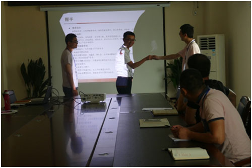 培訓(xùn)伊始,李星副經(jīng)理從禮儀的歷史源頭講起,中國(guó)自古以來(lái)就是禮儀之邦,帶領(lǐng)大家體驗(yàn)了一場(chǎng)禮儀歷史文化之旅,通過(guò)古今典故,闡述了禮儀在接待等商務(wù)活動(dòng)中的重要作用。接下來(lái)從著裝、握手、乘車(chē)、宴請(qǐng)座次安排等的注意事項(xiàng)對(duì)接待禮儀進(jìn)行了全面解析。握手是我國(guó)接待禮儀中的重要表達(dá)形式,培訓(xùn)中握手方式的現(xiàn)場(chǎng)演練將培訓(xùn)推向了高潮,參訓(xùn)人員每?jī)扇艘唤M,走上前臺(tái)現(xiàn)場(chǎng)演示,主講人站在一邊糾正講解。有人大方演示,有人靦腆難為情,有人緊張手心出汗,不時(shí)響起陣陣掌聲和哄笑聲,氣氛非常輕松和諧。
