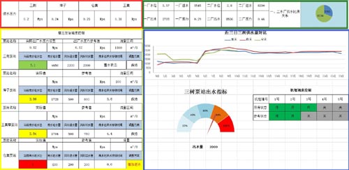 藍(lán)框區(qū)域,鑒于三樹泵站在增壓泵站中的重要地位,專門做了這樣一個(gè)區(qū)域來(lái)進(jìn)行觀察比對(duì)。1、出水指標(biāo)部分:代表三樹泵站的出水量占供水能力的比例,也進(jìn)行了顏色區(qū)分,以起到預(yù)警作用。