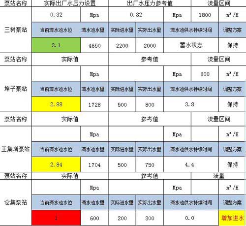 2、當(dāng)清水池液位處在由高到低不同區(qū)間值時(shí),該單元格背景色也會(huì)呈現(xiàn)綠色(安全值)、黃色(關(guān)注值)、紅色(警戒值)的變化。根據(jù)計(jì)算出的清水池持續(xù)供水時(shí)間,調(diào)整方案單元格會(huì)自動(dòng)給出相應(yīng)的調(diào)度方案,有增加進(jìn)水和保持兩種方案。