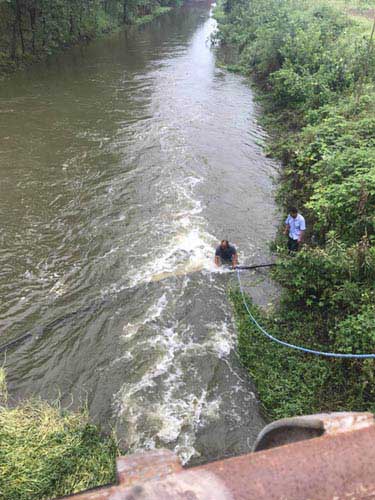 2018年6月28日上午9時左右,龍河區(qū)域供水服務中心營業(yè)廳接到夏圩村客戶來電反映整個村中無自來水使用。隨后,服務受理員通知維修員趕赴現(xiàn)場排查原因。維修員經(jīng)過近1個小時地毯式的排查后,終于在陸圩橋下河內發(fā)現(xiàn)疑似漏點。