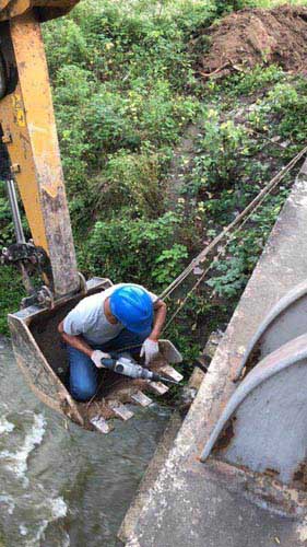 正所謂“眾人劃槳開大船”,雖然難度很大,但在場的維修員協(xié)調合作,眾志成城,熱火朝天地投入搶修工作中。時間就這樣在繁忙且艱巨的搶修工作中一點一點地過去了,下午14時左右,龍河中心備好搶修材料準備開始焊接。但天公不作美,再次下起了瓢潑大雨,焊接管道就無法露天進行。15時左右,大雨驟停,所有維修員立即嚴陣以待,各司其職,搶修工作繼續(xù)有條不紊地開展起來。第一個難題順利解決,迎面而來的是第二個難題,由于操作空間,操作環(huán)境十分復雜,如何固定管道。經(jīng)過認真分析,決定由一名維修師傅將繩子系在腰間,蹲在挖機里進行操作。或許,在看風景人的眼里橋下的風景很美,但在維修員眼中,這是一場技術、勇氣與惡劣環(huán)境的較量。