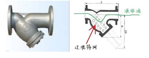 Y型過濾器主要由主管、兩端接管法蘭、濾網(wǎng)、濾網(wǎng)壓蓋、壓蓋密封面密封橡皮圈及壓蓋緊固螺絲等部分組成。當(dāng)液體通入主管路,進(jìn)入濾網(wǎng)后,固體雜質(zhì)顆粒被阻擋在濾網(wǎng)內(nèi),而干凈的液體通過濾網(wǎng),由Y型過濾器出口排出。濾網(wǎng)一般為圓柱狀,目的是加強(qiáng)濾網(wǎng)的強(qiáng)度。