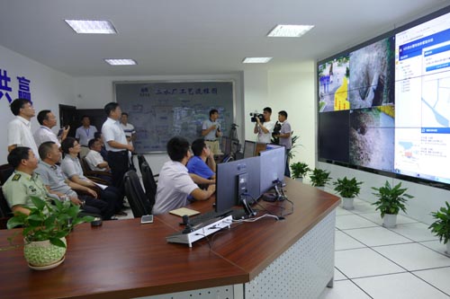 與會人員來到供水調(diào)度中心,從監(jiān)控液晶大屏上可以實時觀看爆管現(xiàn)場的搶修進展及事故區(qū)域壓力監(jiān)測的實時情況。現(xiàn)場指揮、宿遷銀控自來水有限公司總經(jīng)理助理郁莉用對講機向總指揮葉興成副局長匯報請示:一切準備就緒,請總指揮下達命令!葉副局長宣布,演練開始!