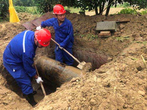 接到指令后,現(xiàn)場搶修人員立刻投入到緊張有序的搶修作業(yè)中,關(guān)閉閘閥,控制現(xiàn)場,設(shè)立警示牌,維護現(xiàn)場秩序;對事故現(xiàn)場進行排水,開挖破損管線,確認是DN400管線接口處破損,隨即展開緊急搶修;