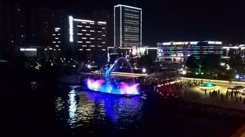 運(yùn)河兩岸人來人往,風(fēng)光美景映入眼簾,每當(dāng)殘陽閉幕,夜便悄悄的落了下來。這里原本是附近居民散步的地方,在政府的大力投資下變成了市民游玩的圣地,傍晚這里燈火通明人山人海,這里有整齊有序的勁走團(tuán),有打的熱火朝天的籃球、羽毛球愛好者,還有歡天喜地的孩童們,娛樂設(shè)施的增加讓這里充滿了活力,這里是餐后散步的最佳選擇,每天橋下有許多的象棋、圍棋愛好者坐在桌邊,探討著下一步的走勢,還有許多的小伙伴們在你來我往的打著乒乓球,樹蔭下的小椅子上坐著對對情侶,他們在說悄悄話呢。一號橋北邊有一坐風(fēng)光帶的象征建筑——銀色的大鯉魚,20:00之前還有美麗的噴泉哦。