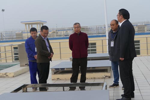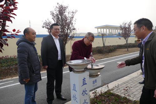 接下來,俞總來到第二水廠生產(chǎn)廠區(qū)視察廠區(qū)建設、生產(chǎn)工藝流程等。途經(jīng)廠區(qū)停車場,看到眾多停放整齊有序的轎車,得知都是公司員工的私家車時,俞總感到由衷的欣慰。他說,聯(lián)合水務的每一位員工都是我們的親人,他們工作舒心、生活順心、富足是我們的責任、追求與榮耀。經(jīng)辦公區(qū)與生產(chǎn)區(qū)隔離的指紋鎖二道門進入生產(chǎn)區(qū),俞總對廠區(qū)嚴謹?shù)陌卜来胧┙o予了好評。視察途中,他不斷與生產(chǎn)人員親切交流,了解生產(chǎn)工藝流程的細節(jié),并給出中肯的點評與建議。在二期深度處理炭濾池,俞總對池體的設計建設提出了意見和建議。從深度處理炭濾池拾階而下,便是直飲水處。俞總不顧冬季水涼,親自品嘗,對口感表示滿意。在三期沉淀池上,俞總舉目遠眺,曾真總經(jīng)理介紹了已經(jīng)成功立項的四期擴建項目情況,俞總提出要求按照繪就的藍圖全力建設,保障安全供水。