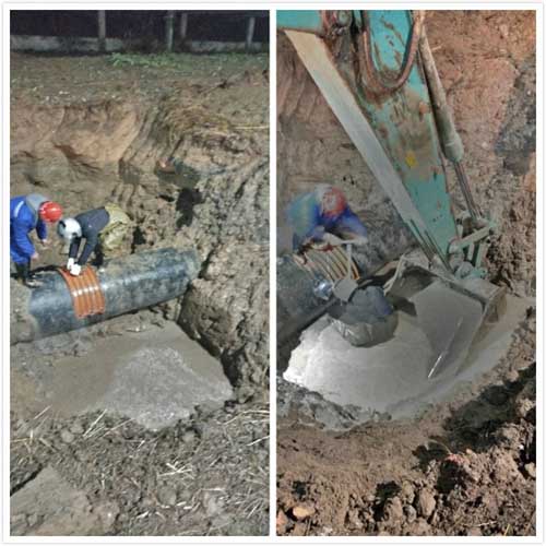 按照韓經(jīng)理指示,根據(jù)現(xiàn)場(chǎng)開(kāi)挖的漏水點(diǎn)確定材料,隨后又電話(huà)聯(lián)系倉(cāng)庫(kù)準(zhǔn)備材料。材料準(zhǔn)備好后,韓經(jīng)理和劉安柱將材料送到現(xiàn)場(chǎng),一切就緒后,著手維修。因操作坑泥漿較多,搶修難度較大,經(jīng)過(guò)3個(gè)多小時(shí)的冒雪搶修,終于將漏水點(diǎn)修復(fù)完畢。