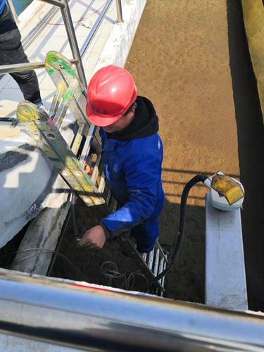 還有我們的老大難問(wèn)題,就是二水廠砂濾池氣管破損漏氣。因?yàn)榍捌跉夤懿捎玫氖前倒,氣管更換難度大,還有在水池里面不好操作,氣管老化嚴(yán)重,之前出現(xiàn)過(guò)因氣管老化,氣管漏氣斷裂等問(wèn)題。所以這個(gè)星期我們制定改造計(jì)劃對(duì)砂濾池氣管進(jìn)行更換,和制水部協(xié)商一下,先把一個(gè)水池水放干,我們下到水池里工作,一個(gè)一個(gè)更換,對(duì)之前老化氣管全部更換成新的氣管,我們采用新的穿線管,對(duì)所以暗管里的氣管進(jìn)行更換,保障在今年的高峰供水中不出現(xiàn)問(wèn)題。