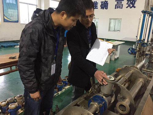 (圖:檢定人員和電磁水表技術(shù)人員檢定電磁水表)