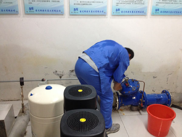(圖5:任汗水濕透衣背,忘我地彎下身軀巡檢二次供水設(shè)備,擔(dān)起的是高層用戶安全用水的大任,怎敢懈。