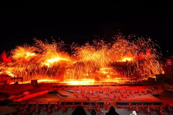 表演正式開始了,這是一個大型的表演型節(jié)目,分為幾個情節(jié)來表演,隨著幾聲雞叫聲,農戶的窗戶亮了,農民起床開始生火、燒鐵,打鐵聲叮叮當當,瞬間讓人感受到那種與世無爭、自然和諧的生活情趣。中間穿插幾個舞蹈,賣鋼針等表演,最后是壓軸大戲“澤州打鐵花”。只見在假山頂上、半山腰上有幾十個赤膊壯漢,隨著音樂響起或喊起號子一起將鐵花打向十幾米的天空、或此起彼伏的輪流將鐵汁拋灑向高空,鐵汁花帶著1600攝氏度的高溫,從天空劃著優(yōu)美的弧線灑向大地,到地面再次碰撞濺起,或落入水中,響起爆炸聲響,顏色也是姹紫嫣紅,整個天空都被渲染,宛如火樹銀花、金蛇飛舞,又如煙花般綻放,是力量和技巧的完美結合,聲勢之浩大、畫面之優(yōu)美,美輪美奐,無以倫比。