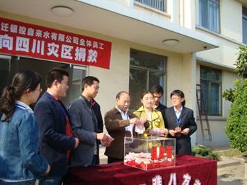 一方有難,八方支援,5月14日,宿遷銀控自來水有限公司組織了對(duì)汶川災(zāi)區(qū)人民的捐款活動(dòng);顒(dòng)消息一經(jīng)公布,立即得到了全體員工的踴躍響應(yīng)。他們說:“我們雖然無(wú)法身臨災(zāi)區(qū)參加救助活動(dòng),但是,用捐款的方式表達(dá)我們的關(guān)心和支持也是我們的心愿”。