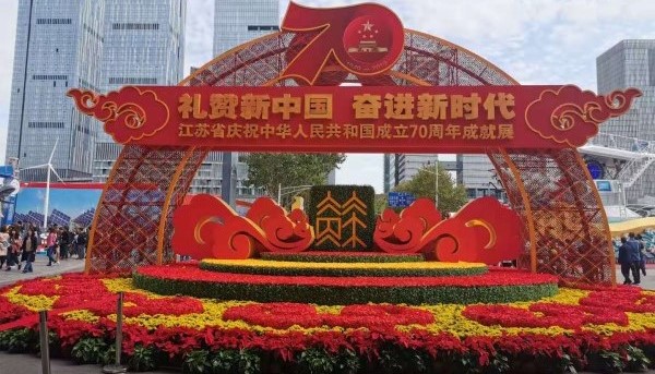 通過安檢,首先進入室外展區(qū),正前方映入眼簾的此次展會的大型主題“新贊新中國 奮進新時代”的主題展區(qū),在花團的簇擁下展會的主題格外的醒目,彰顯新中國成立70周年來,在中國共產(chǎn)黨的領(lǐng)導(dǎo)下江蘇省走過的輝煌且不平凡的發(fā)展歷程。順著參觀通道,我們來到了剛參加完國慶70周年閱兵,主題為“江蘇智造”的江蘇巡禮彩車前。彩車長15米,寬3米,高近6米。在彩車上布滿了 “蛟龍?zhí)柹顫撈鳌、“神威超級計算機”、“智能工程機械”等富含各種元素的江蘇省的科技發(fā)展成果,彰顯“大國重器”的時代使命。接著,由江蘇省科研院所和企業(yè)參與設(shè)計和制造的各種高科技工程機械、農(nóng)業(yè)設(shè)施、航天科技、新能源產(chǎn)品在各自展臺展出,顯示了江蘇省在科技前沿領(lǐng)域的“芯”實力、“芯”科技、“芯”成果。