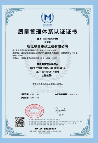 近期梅津(上海)檢測認證有限公司為宿遷聯(lián)合市政工程有限公司頒發(fā)了2020年度三大體系認證證書,標(biāo)志著宿遷聯(lián)合市政工程有限公司順利通過三大體系監(jiān)督年審。