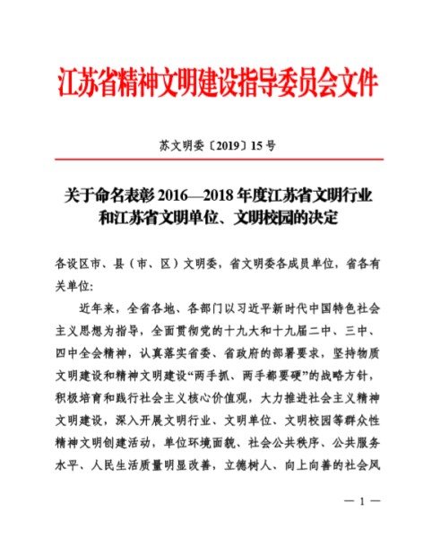 近日,江蘇省精神文明建設(shè)指導(dǎo)委員會(huì)發(fā)文表彰“2016-2018年度江蘇省文明單位”,宿遷銀控自來(lái)水有限公司榮膺在列,這是宿遷銀控繼2010-2012年、2013—2015年獲得“江蘇省文明單位”后,第三度蟬聯(lián)此項(xiàng)殊榮,充分展現(xiàn)了公司勇?lián)鐣?huì)責(zé)任、弘揚(yáng)時(shí)代新風(fēng)的良好企業(yè)形象。