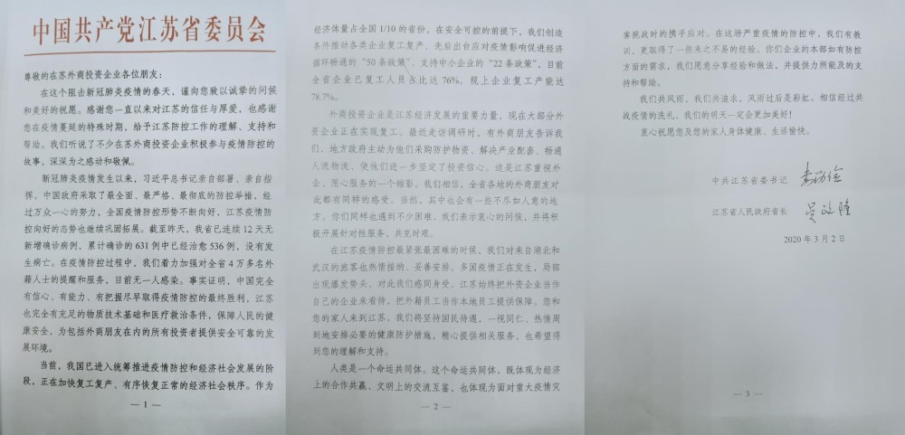 (圖:江蘇省人民政府領(lǐng)導(dǎo)感謝信圖片)