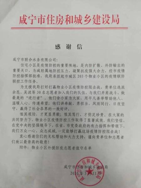 [ 咸寧市住建局致咸寧聯(lián)合水務(wù)的感謝信 ]