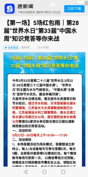 全民總動員開始啦!網(wǎng)絡(luò)倡議書簽名轉(zhuǎn)發(fā)活動,倡議書內(nèi)容豐富,既有宿遷市水資源知識,還有節(jié)水小竅門呢,以百姓喜聞樂見的微信群、通過微信群、微信朋友圈方式進(jìn)行轉(zhuǎn)發(fā);網(wǎng)絡(luò)答題贏紅包活動,5場“紅包雨”,第28屆“世界水日”、第33屆“中國水周”知識全民競技,寓教于樂;意見建議征集活動,保護(hù)水資源,你獻(xiàn)計,他獻(xiàn)策,水更清、城更美,民更樂;網(wǎng)上攝影展活動,用鏡頭拍下最美水景,感受水鄉(xiāng)靈韻;水美文章征文活動,分享《童年的河》,一水一情,讓故鄉(xiāng)的水在心間流淌;彩印卡片+鮮花贈送活動,水法宣傳不見面,投放在銀行、商場、醫(yī)院、公園、公交站臺等公共場所,全民知法、懂法、守法,愛護(hù)水源,人人有責(zé)。宿遷銀控自來水有限公司動員公司全體員工積極參與各類活動,以實際行動支持節(jié)水、護(hù)水、愛水行動。