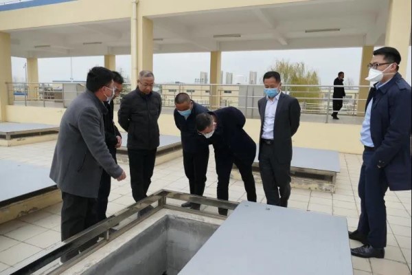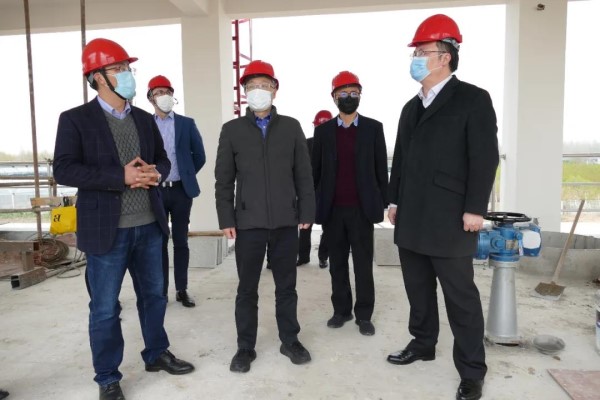 不顧舟車勞頓,俞總裁一行首先來到在建的第二水廠四期擴建工程現(xiàn)場。集團建設管理部副總經理葉峰向俞總一行介紹項目概況及進展情況。第二水廠四期擴建項目是在母公司聯(lián)合水務集團大力支持下,宿遷公司為適應宿遷市經濟社會的快速發(fā)展,未雨綢繆建設的工程,是宿遷市重點民生工程。該工程建設規(guī)模15萬噸/日,建設采用網(wǎng)格絮凝+平流沉淀池與清水池疊合工藝,使水處理構筑物結構更緊湊, 提升了土地使用率,凈水工藝采用先進的“臭氧+活性炭”的深度處理方式。該工程于2019年9月開工建設,今年7月高峰供水來臨前投入運行,屆時,宿遷項目公司的供水能力將達43萬噸/日,極大滿足城市發(fā)展供水需求。疫情給工程建設造成了一定的阻擾,但項目部在積極響應政府各項防控疫情政策前提下,千方百計克服困難,保證工程建設進度,目前各項施工及設備采購、安裝已逐漸步入正軌。俞總裁對四期擴建項目的設計規(guī)劃、土建施工、建設管理等給予了充分肯定,并提出了繼續(xù)努力,按期保質保量完成項目建設,為宿遷百姓安全供水做好保障的殷切期望。